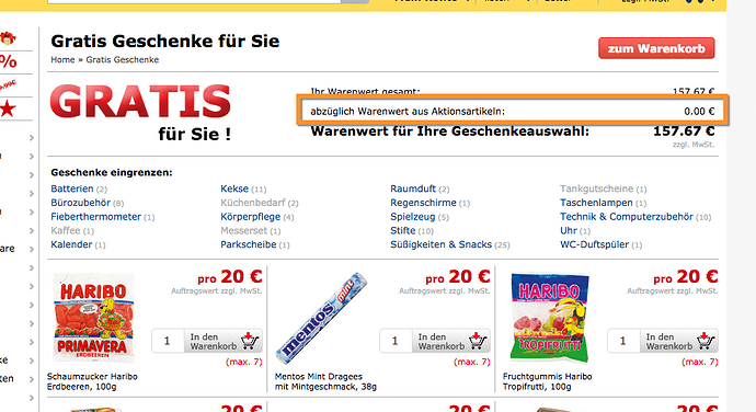 Falls wir die Einschränkung nur im Warenkorb anzeigen (so macht das z.B. Böttcher, auch wenn die Einschränkung dort heute nicht zu funktionieren scheint) habe ich fast alle Daten. Da der „beschenkbare“ Warenwert sowieso schon im Warenkorb gespeichert ist müsste ich dafür nur die Berechnung dieses Wertes anpassen.