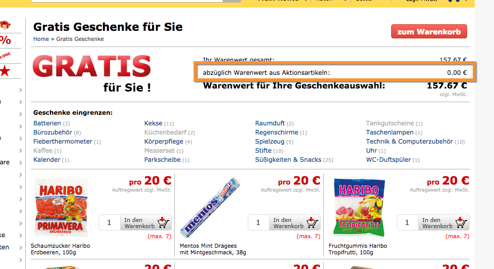 Nachdem wir jetzt an Artikeln auf „Sonderpreise“ und „Aktionen“ hinweisen können könnte man dieses Merkmal verwenden um Artikel von der „Geschenkeberechtigung“ auszunehmen. Soll ich das mal machen?