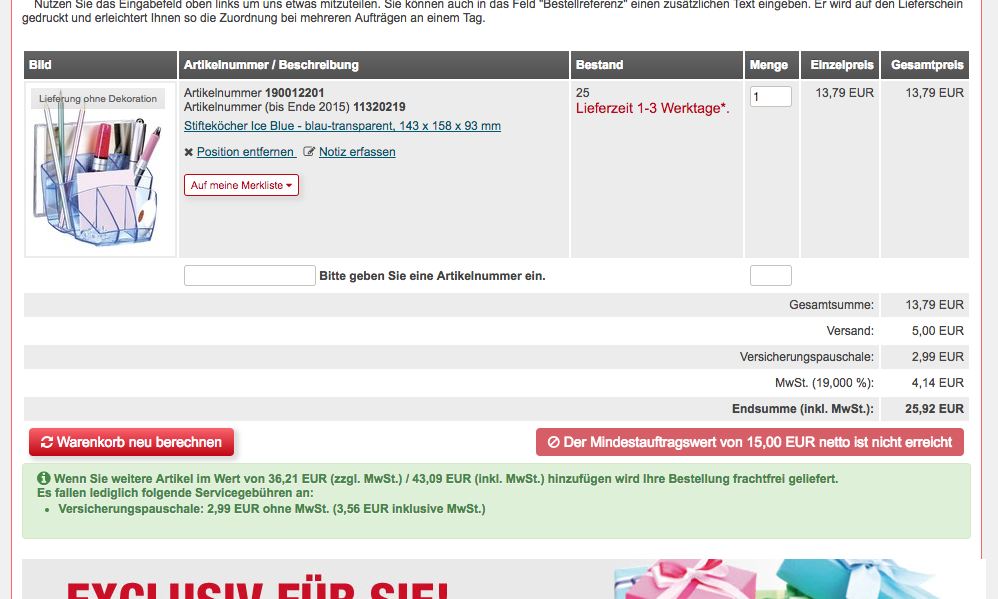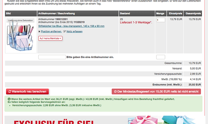 Wie der Name schon sagt - ein Mindestwert unter dem sich ein Auftrag nicht abschicken lässt. Im Moment gibt es einen Prototypen bei dem man einen globalen Mindestwert festlegen kann (gilt für alle Kunden). Unterhalb des Mindestwertes lässt sich der Warenkorb nicht absenden („Kaufen“ Knopf wird umbenannt und ausgeschaltet):