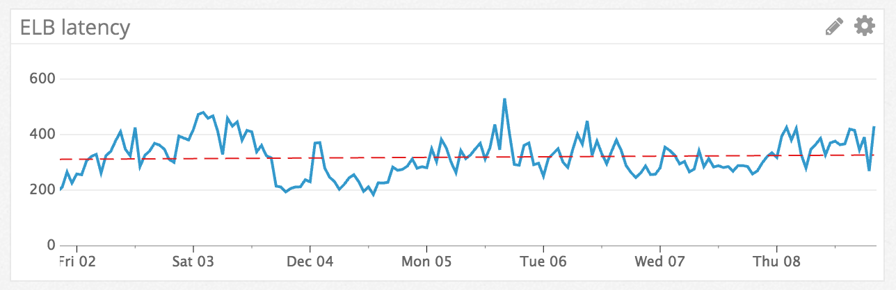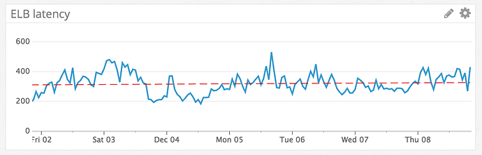 Wir messen zum einen die Antwortzeit unserer Backend-Server (das ist die Zeit die zwischen der Ankunft einer Anfrage aus einem Browser und der Rückmeldung an den Frontend-Loadbalancer vergeht). Wenn sehr wenig los ist liegen wir hier im Mittel um 200ms, normal sind bis ca. 600ms. Diese Woche waren wir im Mittel recht konstant bei unter 400ms (die rote Strichellinie ist der Trend):