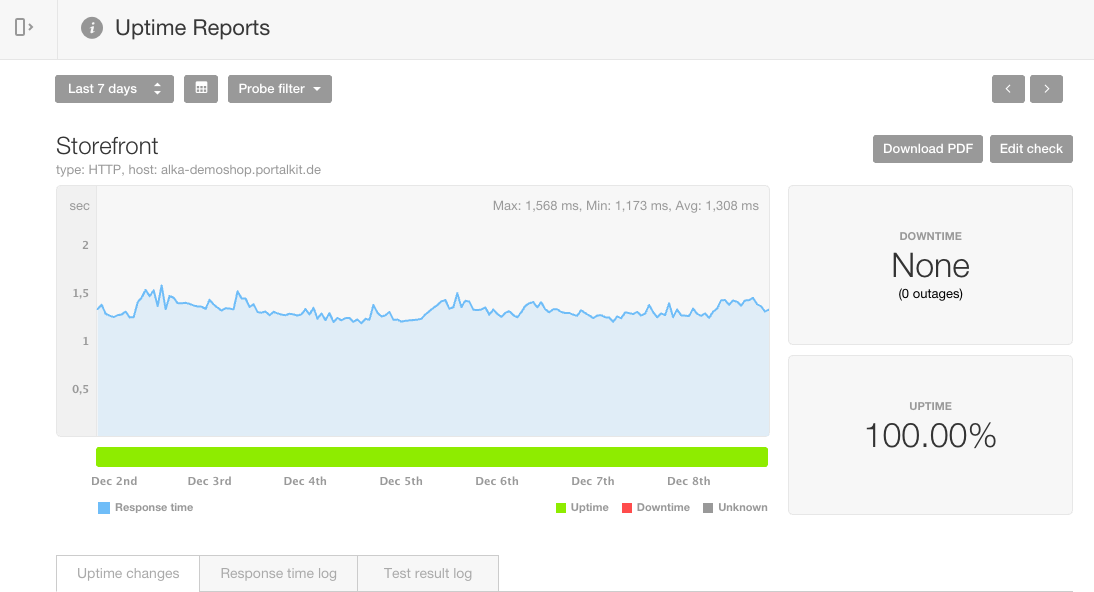 Zum anderen messen wir die „echte“ Antwortzeit, also die Zeit die vergeht zwischen dem Absenden einer Anfrage aus dem Browser bis zur Rückmeldung des Seiteninhalts an den Browser. Hier ist also auch die gesamte Verbindungszeit enthalten die „unterwegs“ verbraucht wird. In den letzten sieben Tagen waren wir für die Startseite dabei im Mittel bei 1300ms:
